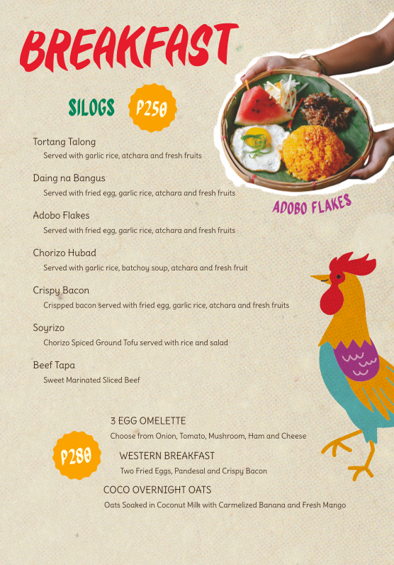 Served with fried egg, garlic rice, atchara and fresh fruits